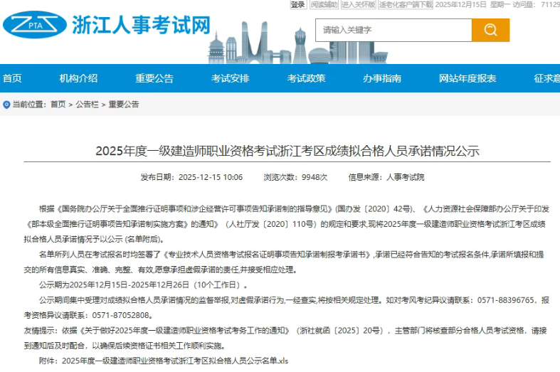 2025年12月15日,浙江人事考试网发布全省一建合格人员公示。