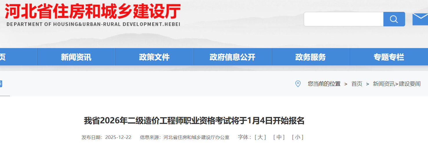 近日,省住房城乡建设厅等四部门联合印发通知,明确河北省2026年二级造价工程师职业资格考试有关事项。