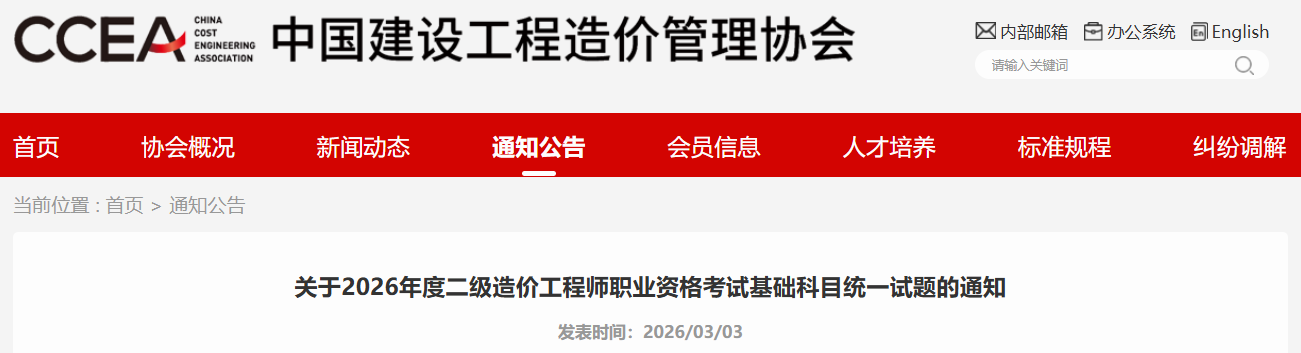 为做好2026年度全国二级造价工程师职业资格考试相关工作,中国建设工程造价管理协会拟组织命制基础科目《建设工程造价管理基础知识》统一试题。请各地有意向使用此科目试题的相关考试主管部门联系中价协。此科目统一试题的统一考试时间为2026年6月13日(周六)下午14:00-16:30,请知悉。