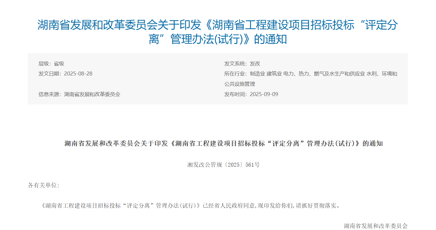 湖南省已经专门出台了“评定分离”的管理办法。这样一来,既压实了招标人“谁投资、谁负责”的主体责任,也有效分散了评标专家被“围猎”的风险。