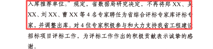 后续的通报大家估计也看到了:本着对评标专家个人身体健康和生命安全负责、保障每一个招标项目评标活动顺利进行、避免评标期间发生人身意外,不再将4名专家聘任为省综合评标专家库评标专家,并调整出库。