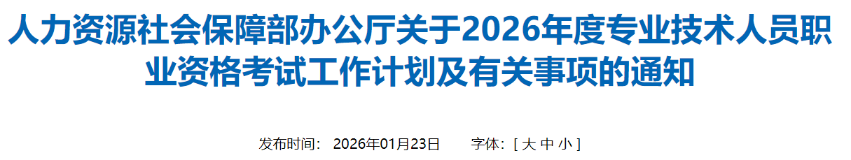 人力资源社会保障部办公厅发布《关于2026年度专业技术人员职业资格考试工作计划及有关事项的通知 》,