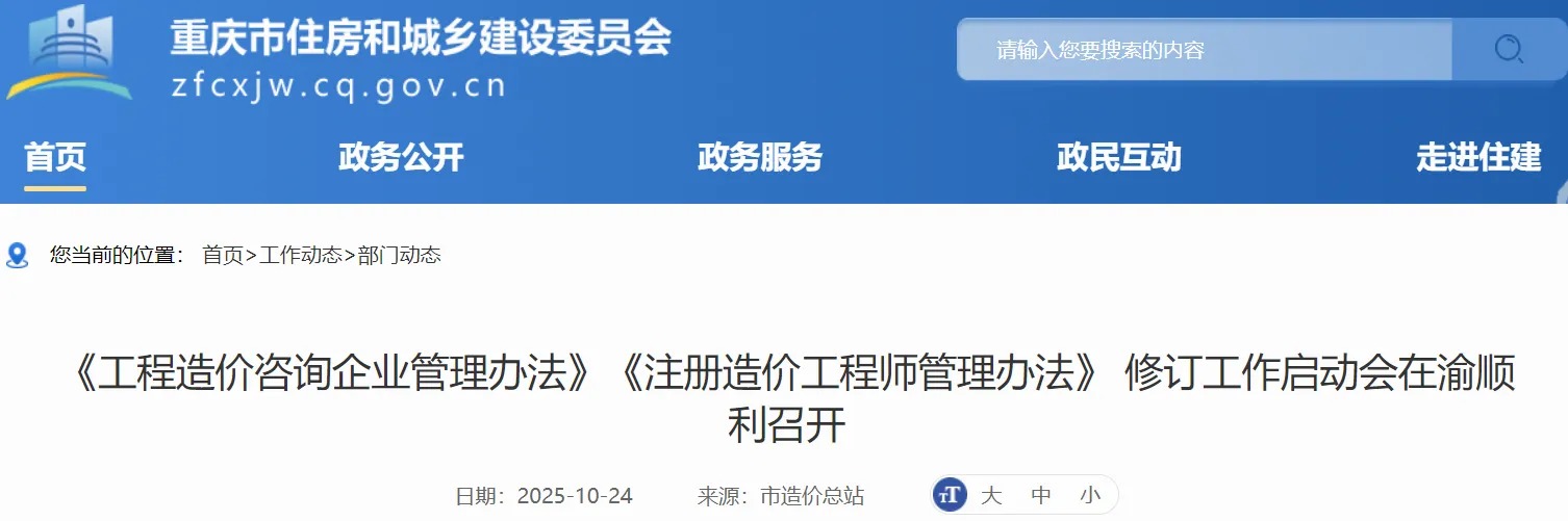 25年10月,重庆住建委发布《工程造价咨询企业管理办法》《注册造价工程师管理办法》 修订工作启动会在渝顺利召开的通知